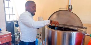 Waiyaki Way Beekeepers Chief Executive Officer Erick Kamau operates a pasteurizer machine at the processing plant at Kinoo area in Kiambu on February 24, 2025.