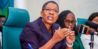 Attorney General Dorcas Oduor addresses journalists during the unveiling of the Government Critical Litigation and Loss Mitigation Review Committee on May 29, 2025 at the State Law Office in Nairobi.