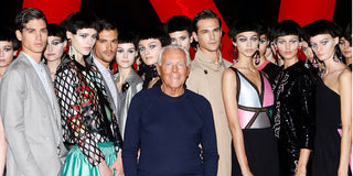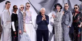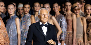 Designer Giorgio Armani stands next to models during the Emporio Armani Spring/Summer 2025 collection at the Fashion Week in Milan, Italy on September 19, 2024.