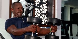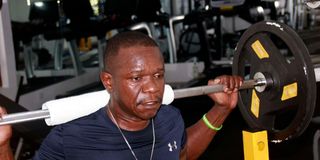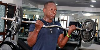 Fitness instructor Morris Ongere performs a barbell bicep curl at the gym in Mombasa.