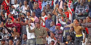 Harambee Stars fans cheer on their team during the Chan match against Angola at Moi International Sports Centre, Kasarani, on August 7, 2025.