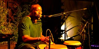 Singer-songwriter and percussionist Idd Aziz performs on drums during Showcase Wednesday at the Alliance Française Gardens in Nairobi on March 6, 2019.