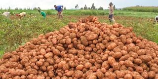 Farmers harvest their Irish potatoes on their farms in Mau Narok, Nakuru County on August 12, 2024. GM potatoes will be grown in the potato growing areas.