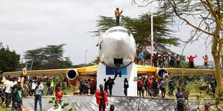 Mourners stand on a grounded aeroplane, after the arrival of the body of former Kenyan Prime Minister Raila Odinga, who had been receiving medical treatment in India when he died, outside the Jomo Kenyatta International Airport in Nairobi, Kenya October 16, 2025.