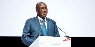 Transport, infrastructure, housing, urban development and public works Cabinet Secretary James Macharia making his presentation at the Dubai world expo. PHOTO | POOL
