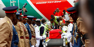 The body of former prime minister Raila Odinga, who had been receiving medical treatment in India when he died, arrives at the Jomo Kenyatta International Airport in Nairobi on October 16, 2025.