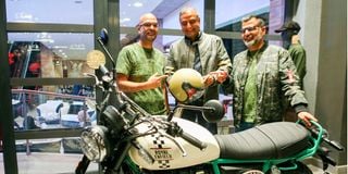 From left: Abid Ganatra (GPE Director), Arun Gopal (Royal Enfield Head of International Business) and Altaf Ganatra (GPE Managing Director) with a Bear 650 motorcycle during the official launch on October 8, 2025, at Rosslyn Riviera Mall in Nairobi.