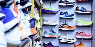 Some of the running shoes on display at Gerry Running Shoes in Nairobi’s Bazaar Building on October 2, 2025.