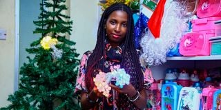 At The Bazaar Plaza, in Nairobi city centre, Emmah Cherotich holds a remote control, switching through different lighting patterns on snowflake-shaped fairy lights.