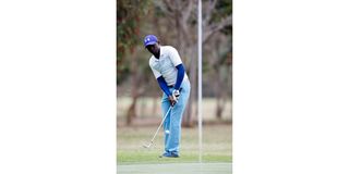 Simon Njogu follows his putt at the 15th hole green during the Kabete Open 2019 Round 3 at Vetlab Sports Club.