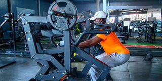 Collins Omondi, fitness consultant and enthusiast, performs the machíne squat press during his routine workout at Alpha Fit Gym along Kiambu Road on October 2, 2025.