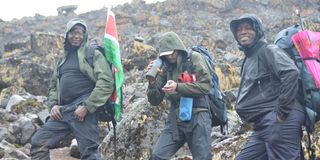 James Kagambi, left, leads a team of Kenyan mountaineers to the summit of Point Batian on Mount Kenya to raise the national flag on December 12, 2013, to mark 50 years of independence.