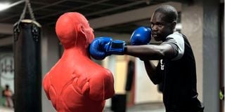 Boxing coach Hassan Abdul Salim throwing a leading hook at a heavy punching bag at the Workout Warehouse gym Nairobi on March 7, 2025.
