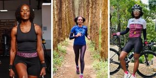 Lorna Bonareri, 53, executes a lunging exercise with kettlebells at Smart Gym in Nairobi (left), goes for a jog in the Kefri Zambezi Forest (centre), and poses for a photograph before setting off on a 70km cycling expedition.