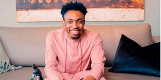 Nigerian visual artist Ekene Ngige with his artwork at Nomadic Art Gallery, Nairobi, 2025.