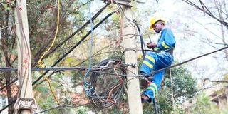 An employee of the Kenya Power and Lighting Company (KPLC) conducts repair and maintenance work along State House Road in Nairobi on November 15, 2025.