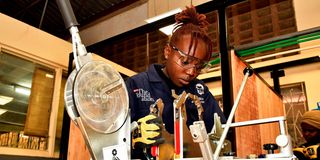 Velma Ondeche, a student studying a plumbing course at Don Bosco Boys Town Technical Institute, operating a butt welding machine at the school located in Karen on September 13, 2023.