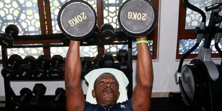 Fitness instructor Morris Ongere performs a barbell bicep curl at the gym in Mombasa.