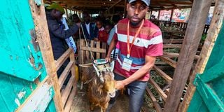 Chamugo Dairy Goats Farm CEO, Caleb Mwenda, poses with his award-winning Toggenburg breeder goat, crowned champion at the 2025 Agricultural Society of Kenya (ASK) Nairobi International Trade Fair at Jamhuri Park on October 3, 2025.