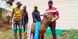 Chamugo Dairy Goats Farm CEO, Caleb Mwenda (right), poses with his team after their Toggenburg breeder was crowned champion at the 2025 Agricultural Society of Kenya (ASK) Nairobi International Trade Fair at Jamhuri Park on October 3, 2025.