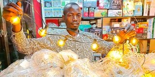 A few streets away, Brian Masava, another seller is also preparing for the season’s rush. The time is 12:30 pm, and a showroom at Nairobi's ever-busy Tea Room sparkles with thousands of tiny lights.