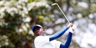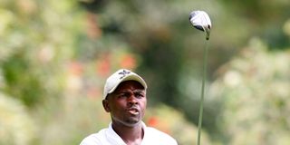 Simon Njogu follows the progress of his tee off from the 14th hole tee during the Muthaiga Open Golf tournament on February 17, 2019 at the Muthaiga Golf Club